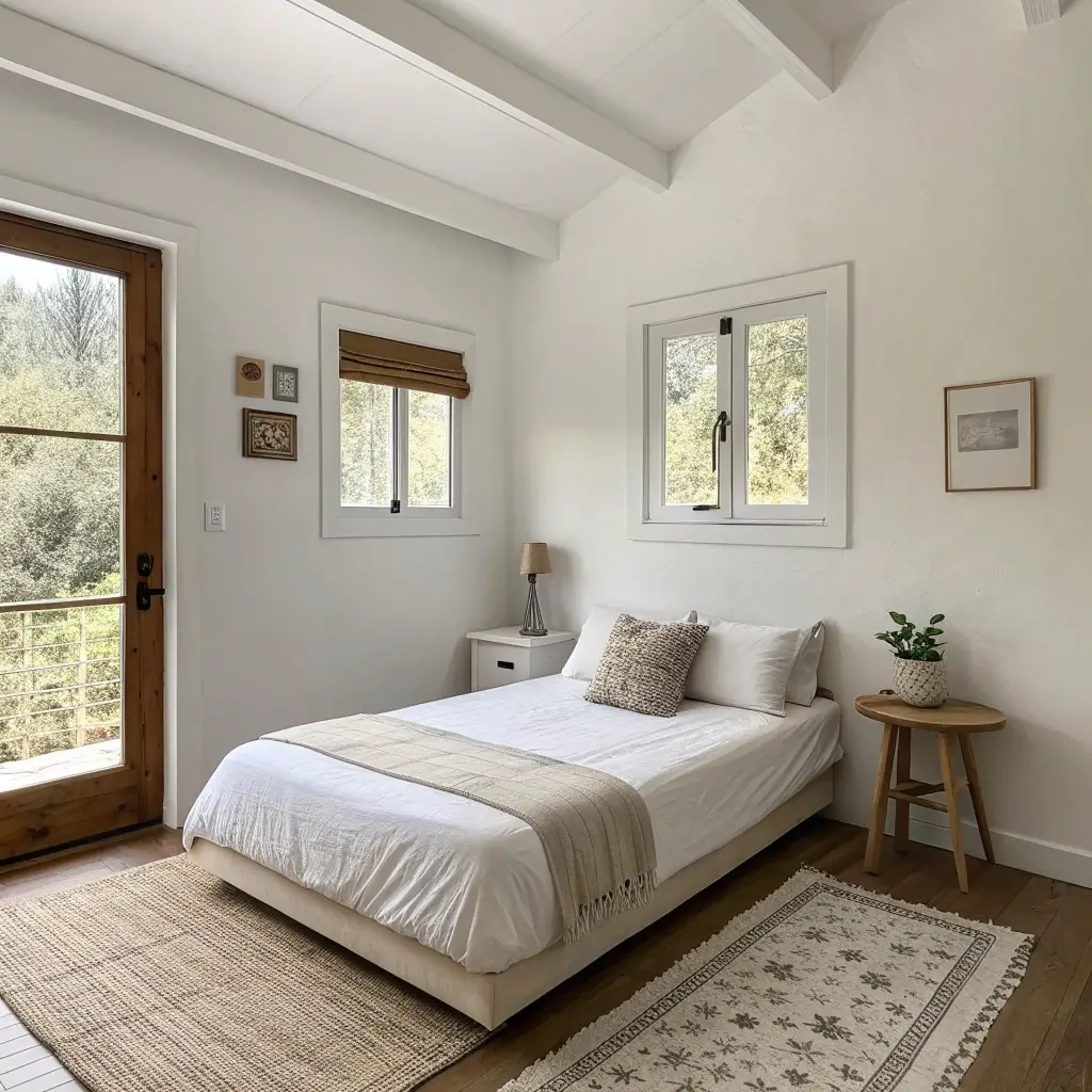 - White walls with one accent wall in soft gray or sage