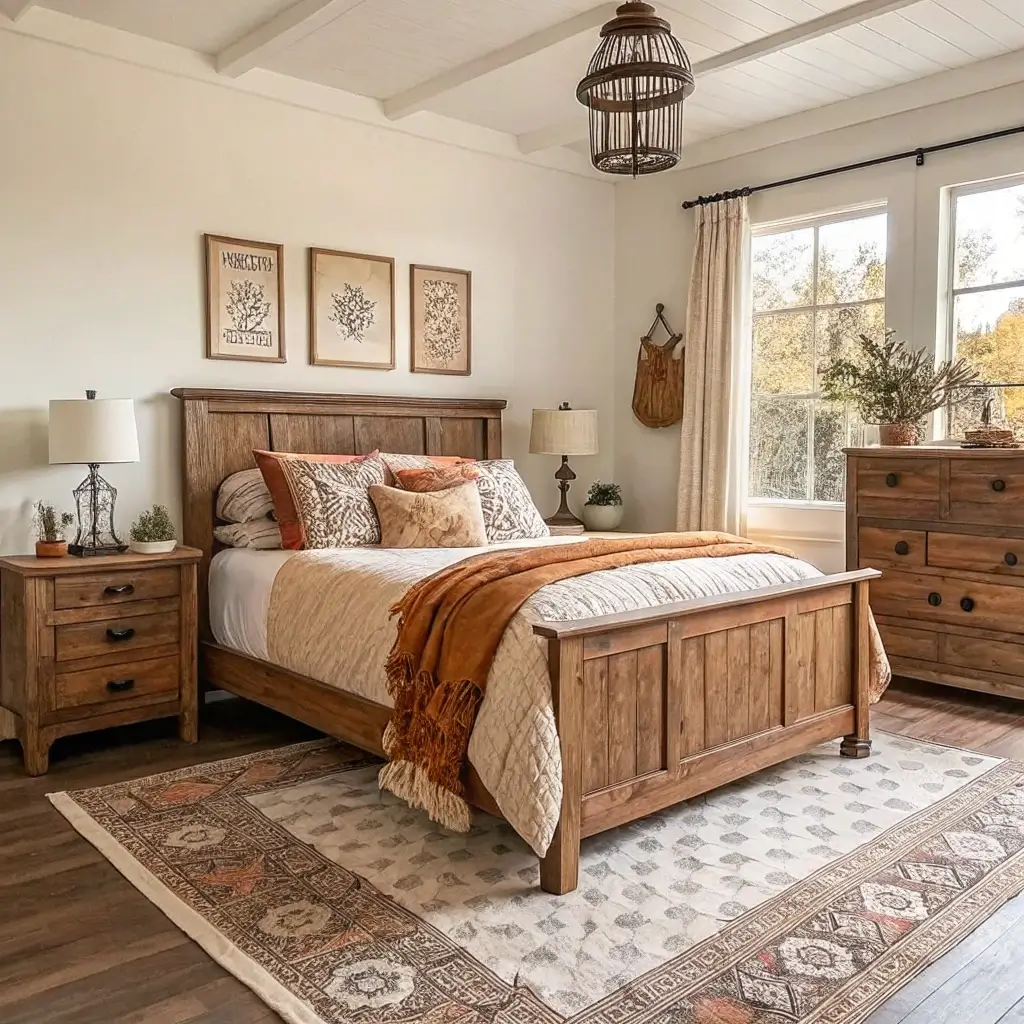 - Reclaimed wood accent pieces (headboard, shelving)