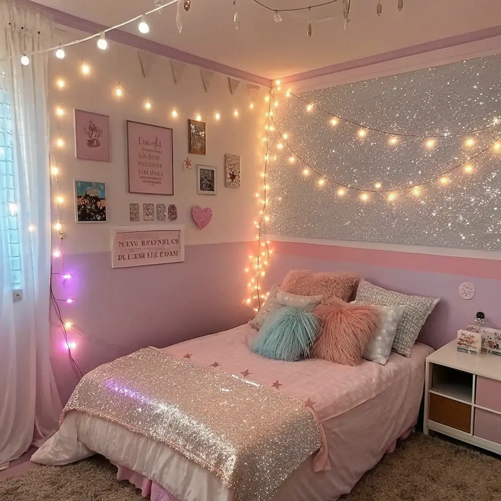 Start with a pink or purple color palette as your base. Not just any pink – we need that specific bubblegum pink that dominated every teen girl’s room. Layer in metallics, particularly silver and gold, to add that star quality. Your bed should look like somewhere a pop star would write their diary while talking on a bedazzled flip phone.