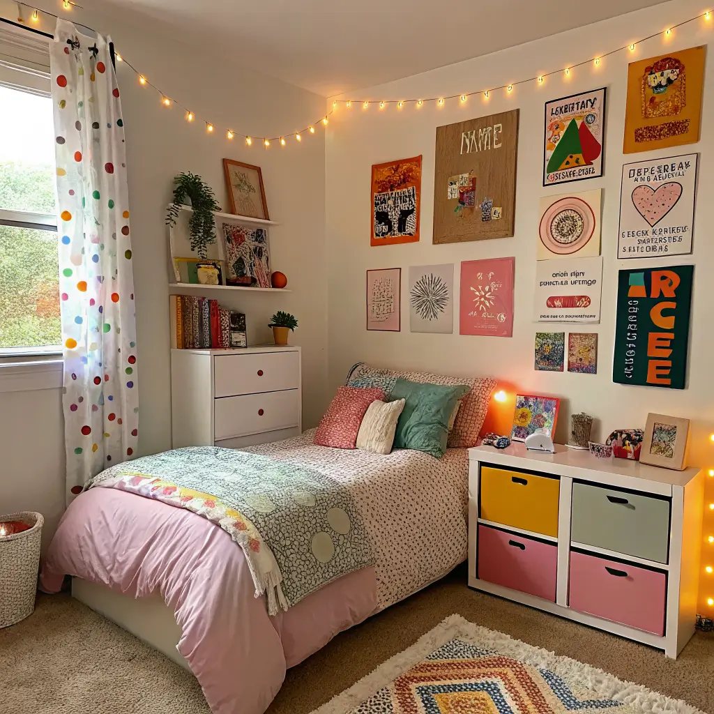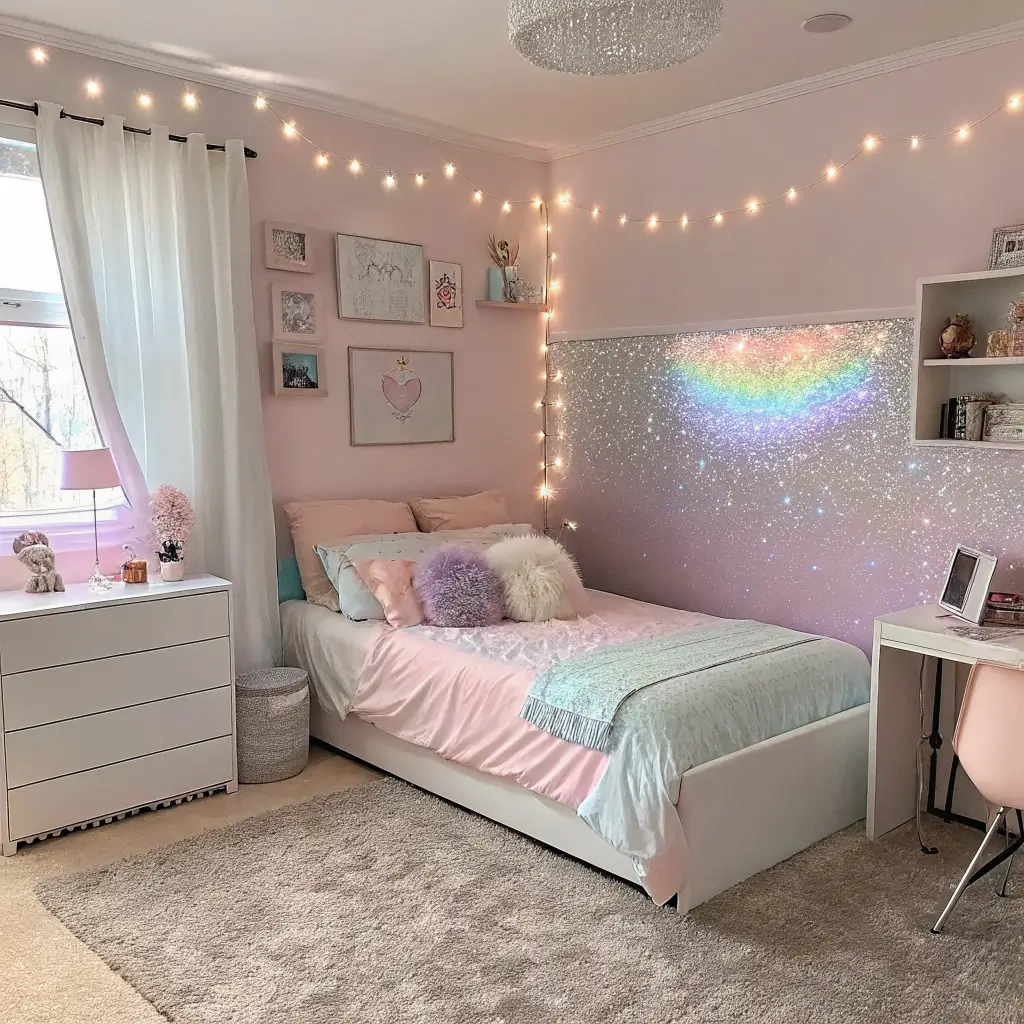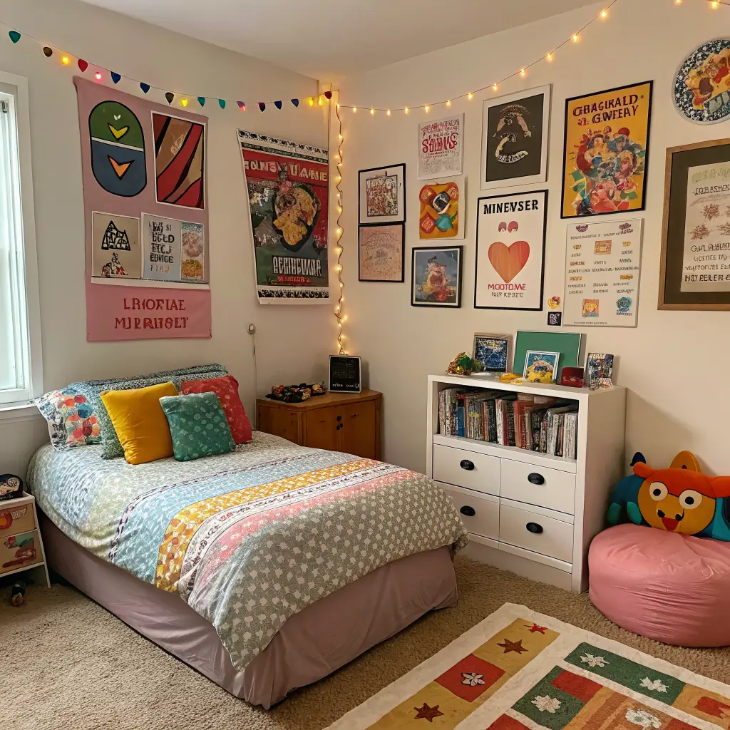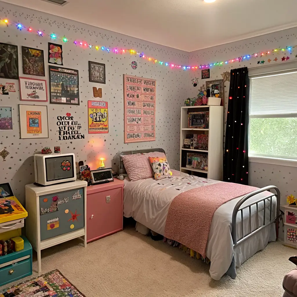 Start by incorporating holographic or iridescent elements throughout your space. Think butterfly chairs with sparkly fabric, curtains with sequin panels, or those iconic beaded door curtains that made you feel like a celebrity entering your own room. The goal? Make your bedroom look like a Lisa Frank folder exploded in the best way possible.