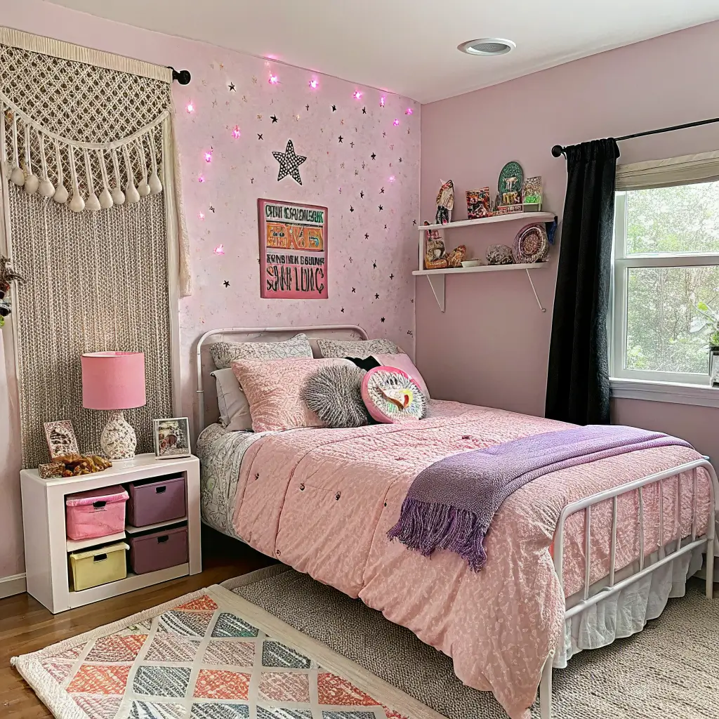 The color palette focuses on lavender, baby pink, and mint green mixed with black accents. Your room should look like Wednesday Addams discovered pastels and decided she kind of liked them. It’s giving “I shop at both Hot Topic and Sanrio,” and that’s exactly the energy we want.