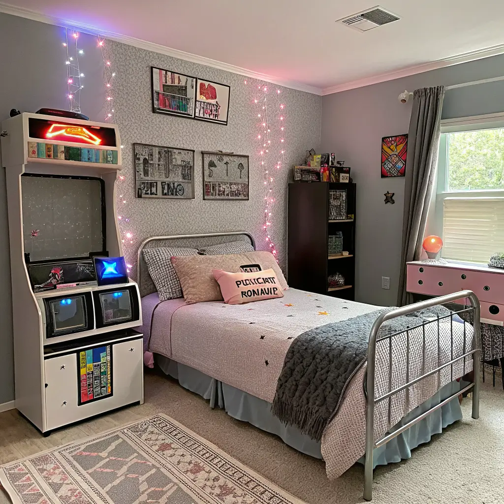 Focus on incorporating chrome, silver, and holographic surfaces paired with strategic neon highlights. Your desk chair should look like it belongs in a spaceship, while your wall art screams “I party at raves.” It’s a delicate balance, but when you nail it, your room becomes instantly iconic.