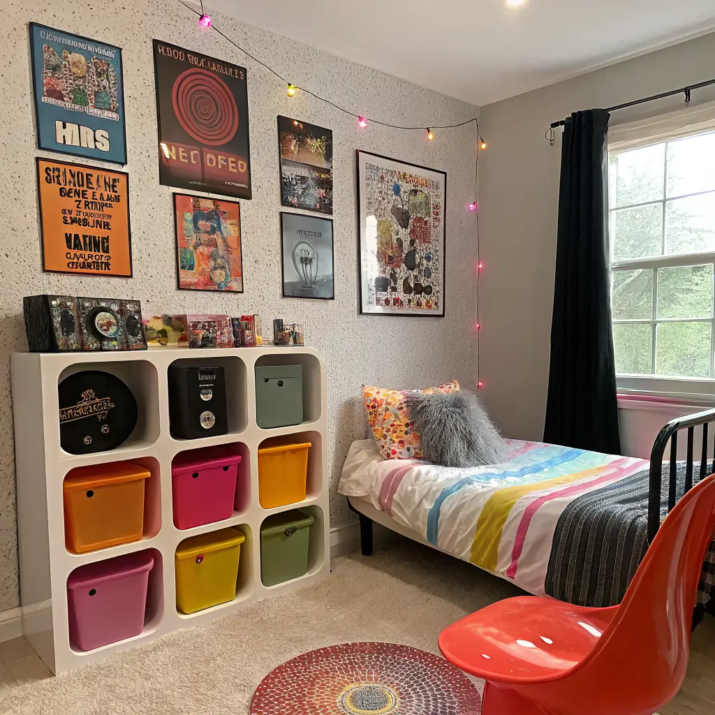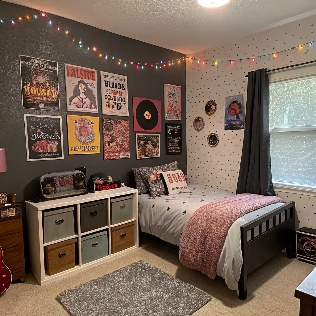 I personally love adding vintage band tees as wall art – just stretch them over canvas frames for instant punk credibility. Throw in some studded throw pillows and a few strategically placed vinyl records, and you’ve got yourself a room that would make any 2000s scene kid proud.
