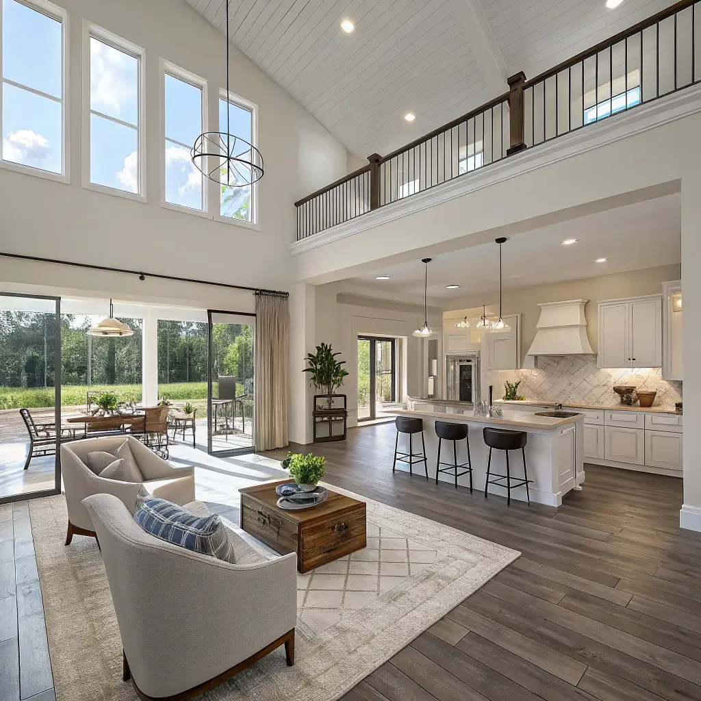 • Open floor plans that connect living, dining, and kitchen areas