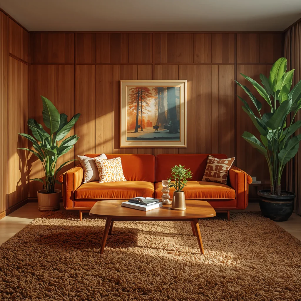 Statement furniture pieces make or break your retro living room. Hunt for a curved sectional sofa in burnt orange or chocolate brown – trust me, these colors work with everything. Can’t find vintage? Modern retailers now make killer reproductions that won’t destroy your bank account.