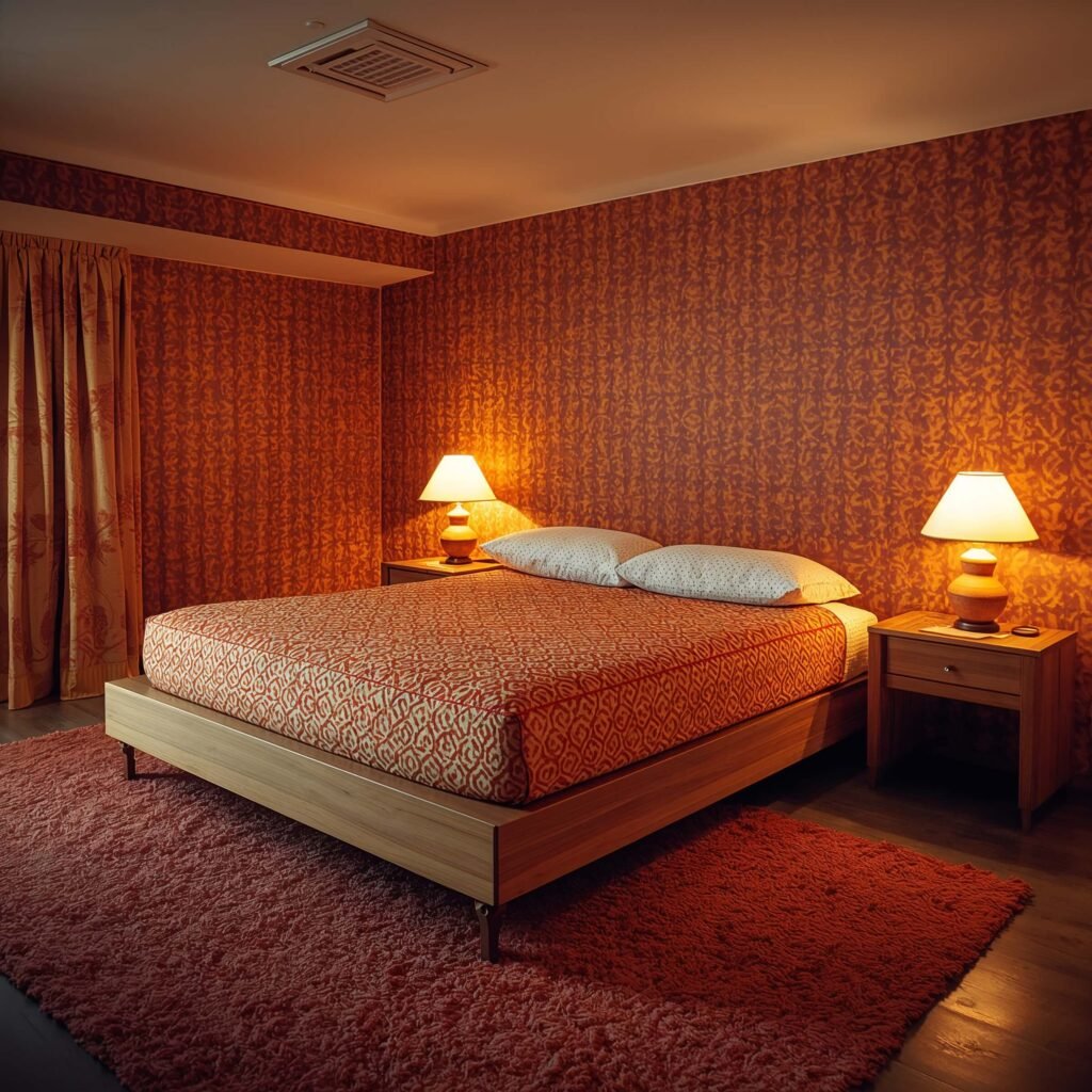 Here’s the trick to 70s pattern mixing: vary the scale. Pair large-scale wallpaper with smaller geometric pillows, or mix floral wallpaper with striped curtains. The 70s didn’t believe in matching – they believed in vibing, and there’s a difference.