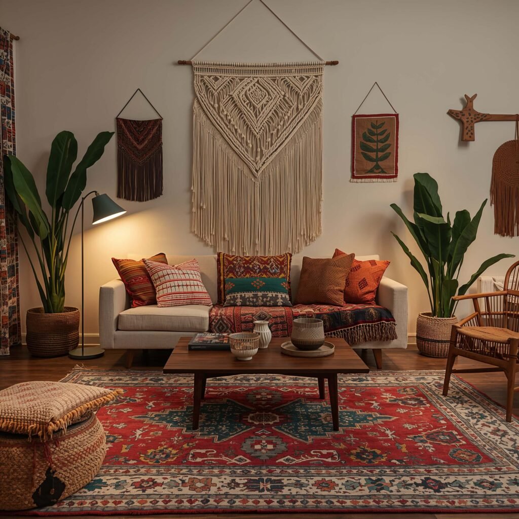Add a macramé wall hanging behind your sofa – they’re everywhere now, and for good reason. Mine cost twenty bucks at a thrift store and completely transforms the wall. Layer in some hanging plants (spider plants and pothos scream 70s), and suddenly your living room feels like a groovy jungle paradise.