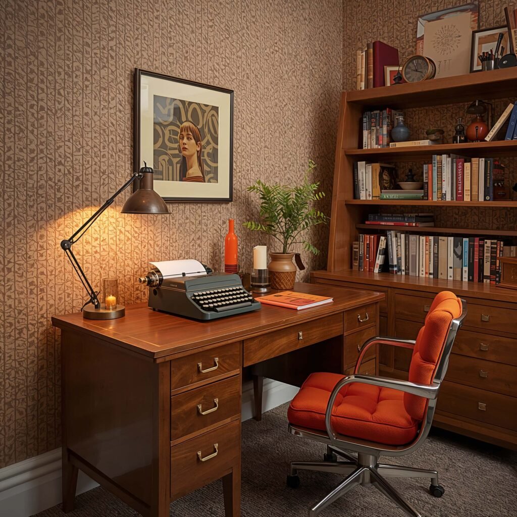 Teak or walnut desks with clean lines provide the perfect workspace. Add an orange or mustard yellow task chair (ergonomic options exist in retro colors now!), and you’ve got a setup that makes Zoom calls more interesting.