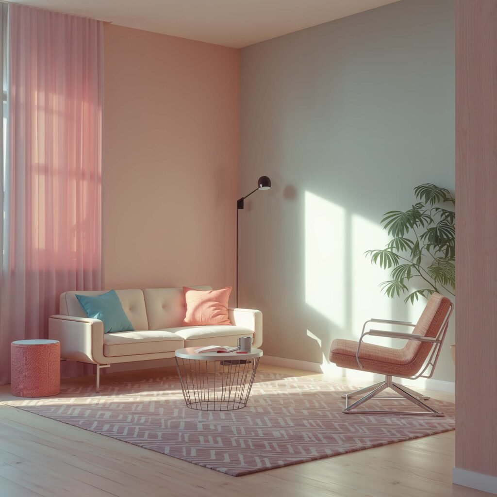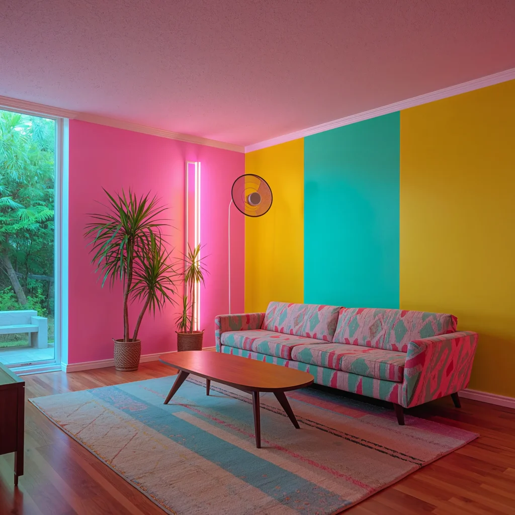 Start with your biggest piece of furniture – usually the sofa. Pick a bold color that makes you smile every time you see it. Then choose wall colors that either complement or boldly contrast with it. Don’t forget about the geometric shapes that made 80s design so iconic. Think triangular side tables, circular mirrors, and those gloriously angular coffee tables that look like they belong in a music video.