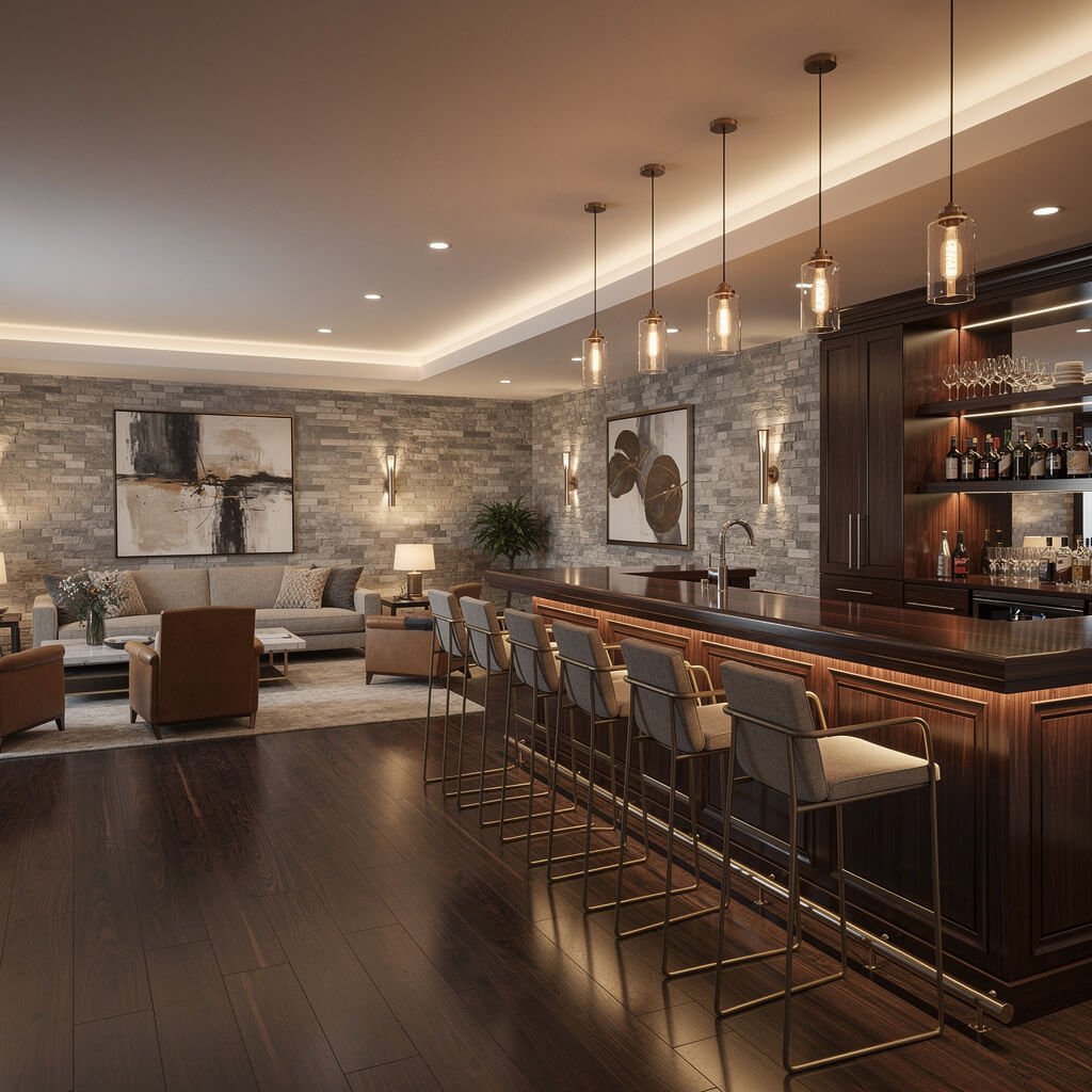 Creating zones without walls requires some creativity. Area rugs become your best friends here, defining each space visually without blocking movement. Different lighting fixtures also help – pendant lights over the bar, recessed lighting in the entertainment area, and maybe some cool LED strips for ambiance.