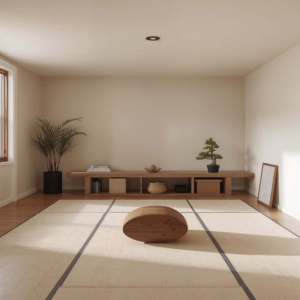 Your floor plan should be mostly open space. Resist the urge to fill every corner. Empty space isn’t wasted – it’s the whole point. One meditation cushion, maybe a low bench, perhaps a small altar or focal point. That’s it.
