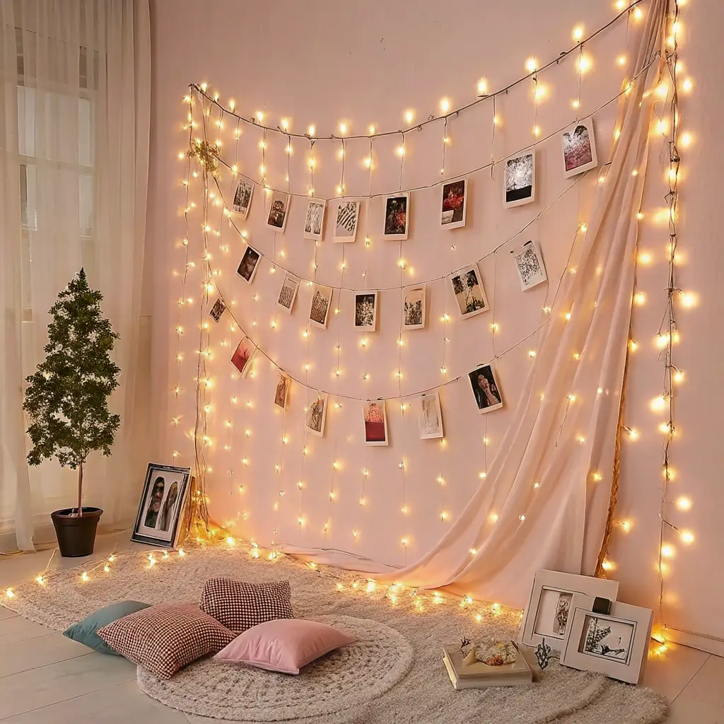 Start with a blank wall or create a backdrop using a large piece of fabric or even a bedsheet in a neutral color. Then comes the fun part – the lights. Warm white fairy lights create the most flattering glow, but you can experiment with different colors if they match your theme.
