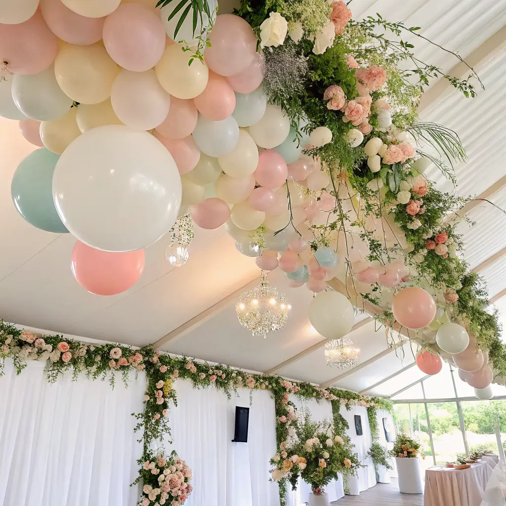Ready to completely transform your space? A balloon and flower ceiling installation creates this incredible overhead canopy that makes everything feel magical. It’s like being inside a garden party dream.