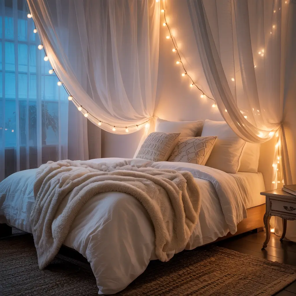 I added battery-operated LED strings behind my sheer curtains last winter, and it transformed my bedroom into this cozy sanctuary. The soft glow through the fabric creates the perfect mood lighting for reading, relaxing, or you know… other bedroom activities 🙂