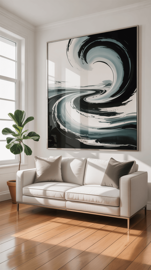Want to make a serious statement? Go big. One massive piece of abstract art can single-handedly define the entire mood of a room.