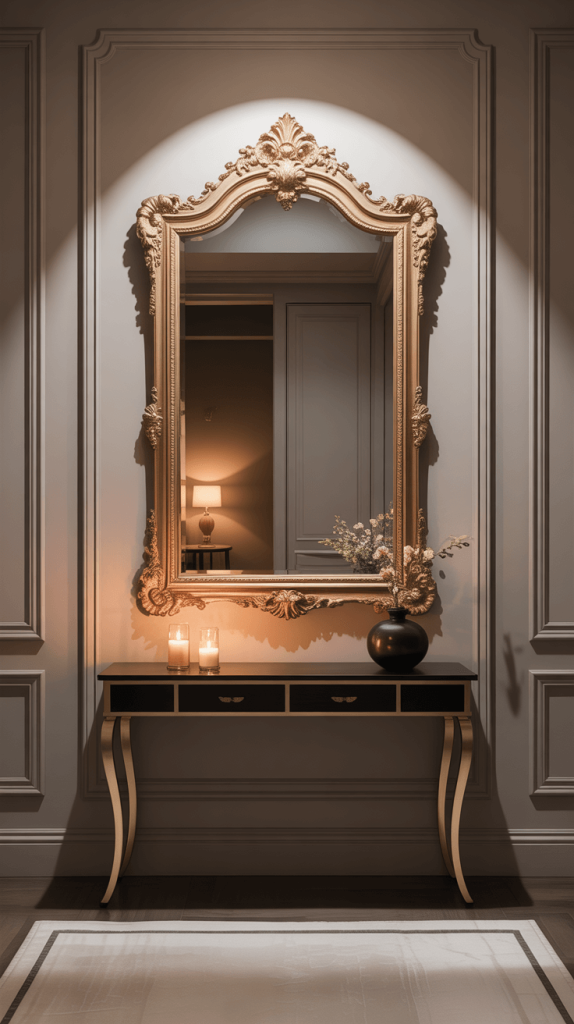 Forget the basic, rectangular builder-grade mirrors. Go for something with character! An ornate gold-leafed mirror adds glamour and old-world charm.