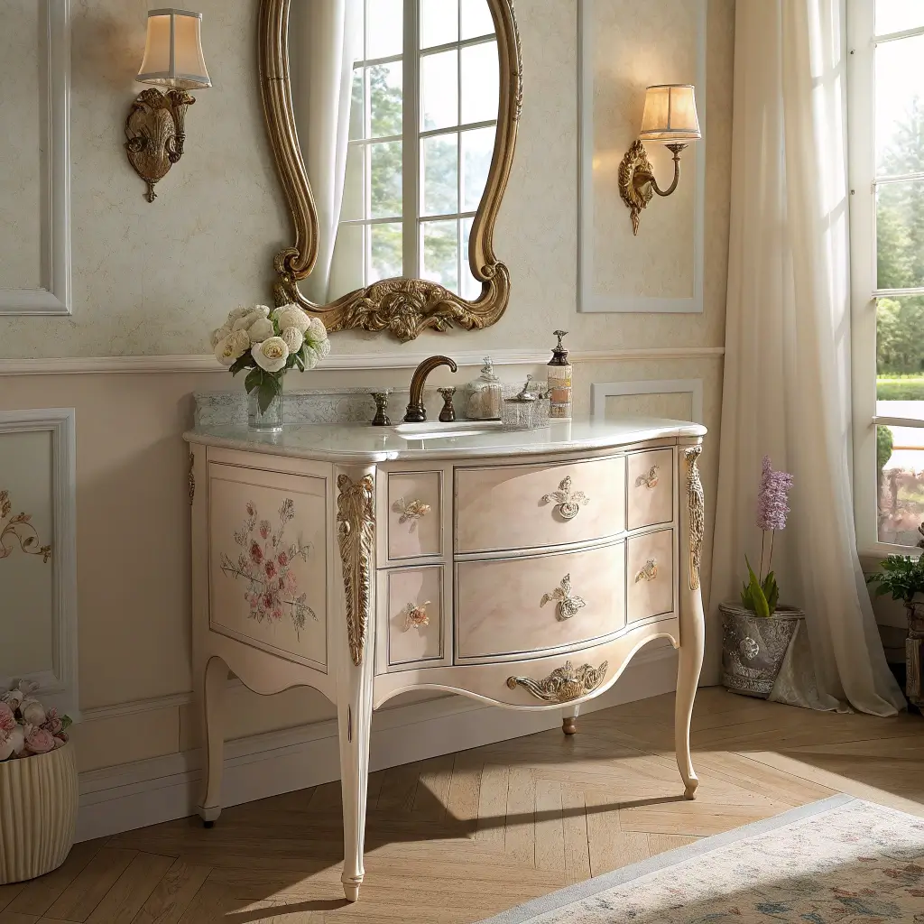 Authentic French Provincial vanities showcase cabriole legs (those sexy curved ones), soft edges, and delicate hardware. The wood often features a distressed painted finish, typically in whites, creams, or soft pastels. Gold leaf accents? Even better.