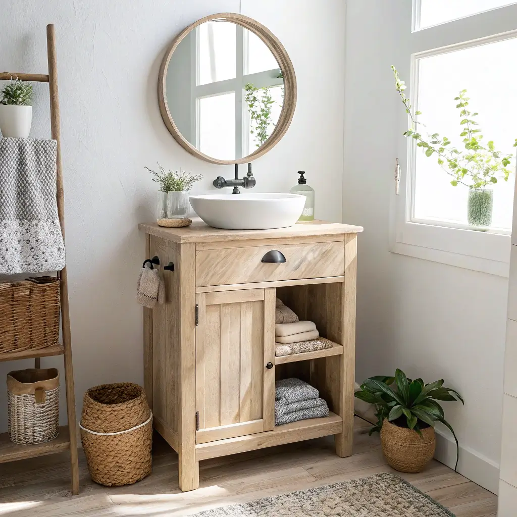 Look for simple, sturdy construction with minimal ornamentation. Painted wood in whites or soft grays works perfectly. Open shelving below stores vintage baskets or folded towels. Apron-front sinks complete the look.