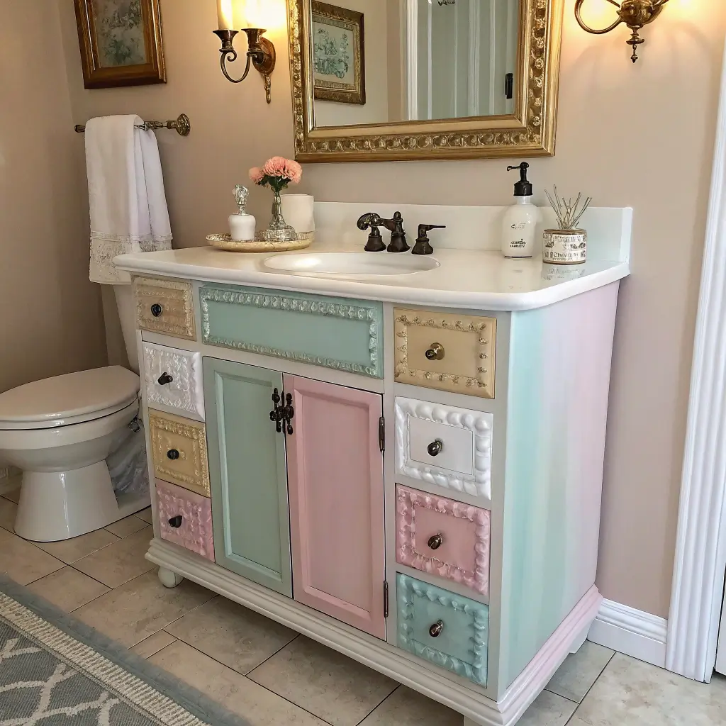 Replace basic hardware with vintage glass knobs or ornate metal pulls. Mix metals if you’re feeling adventurous – a little brass with silver creates visual interest. Add a vintage hand mirror, some lace doilies, and maybe a small chandelier for full shabby chic impact.