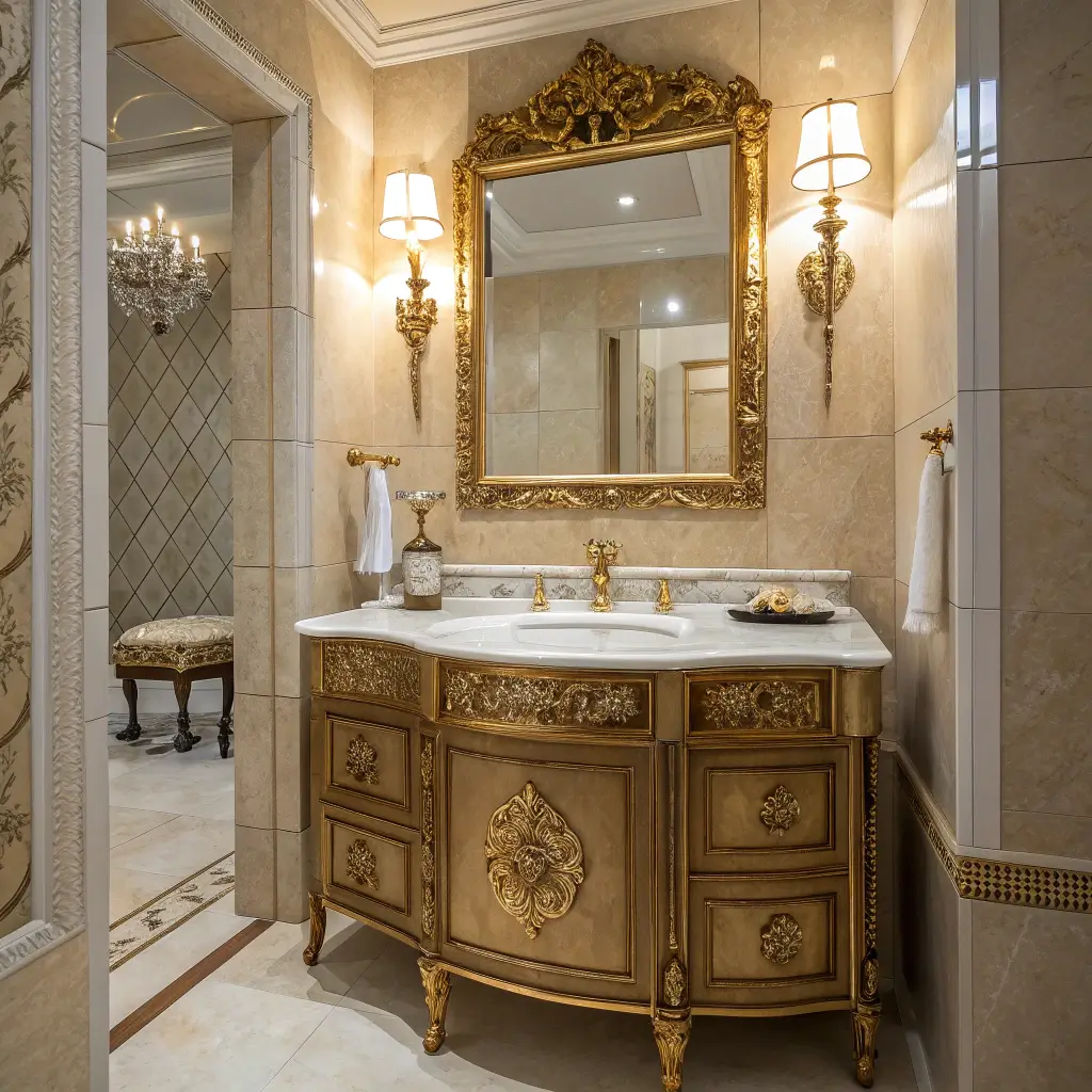 Start small with gold drawer pulls or faucets. Graduate to gold-framed mirrors or light fixtures. Feeling bold? Add gold leaf to carved details or vanity legs. The key is restraint – too much gold feels Vegas, not vintage.