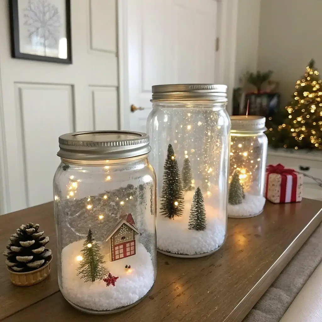 My kitchen windowsill currently features five mason jar snow scenes, each one different. Total investment? Maybe $20. Looking like a Pinterest queen? Absolutely. The secret is using different sized jars and varying the contents – some have miniature trees, others have tiny deer, one just has “snow” and silver branches.