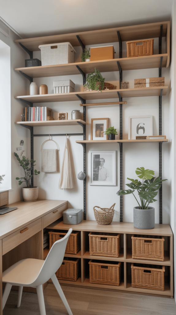- Floating shelves: They take up zero floor space and give you a place to put things. Books, plants, decor—you name it.