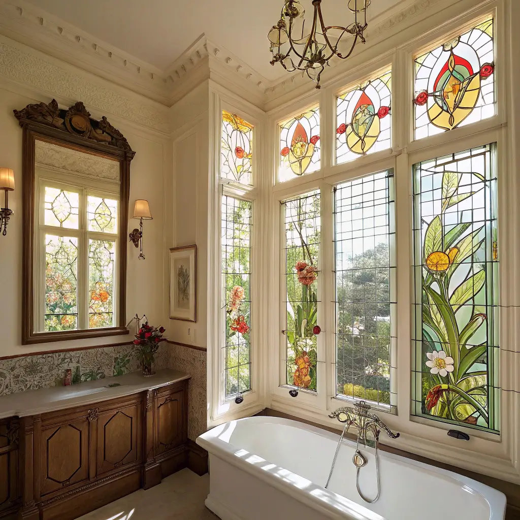 Who says stained glass belongs only in churches? Art Nouveau stained glass brings drama and color into your bathroom while maintaining privacy. It’s basically functional art, and I’m here for it.