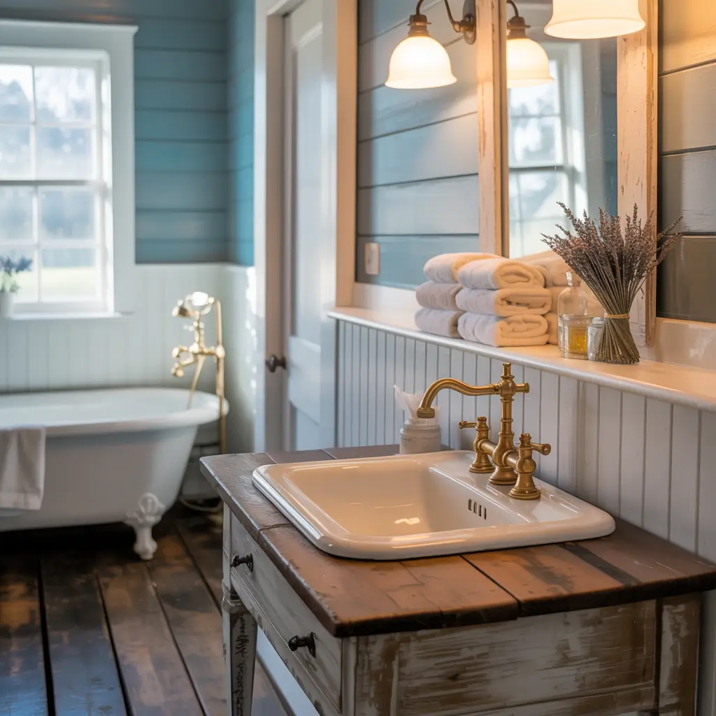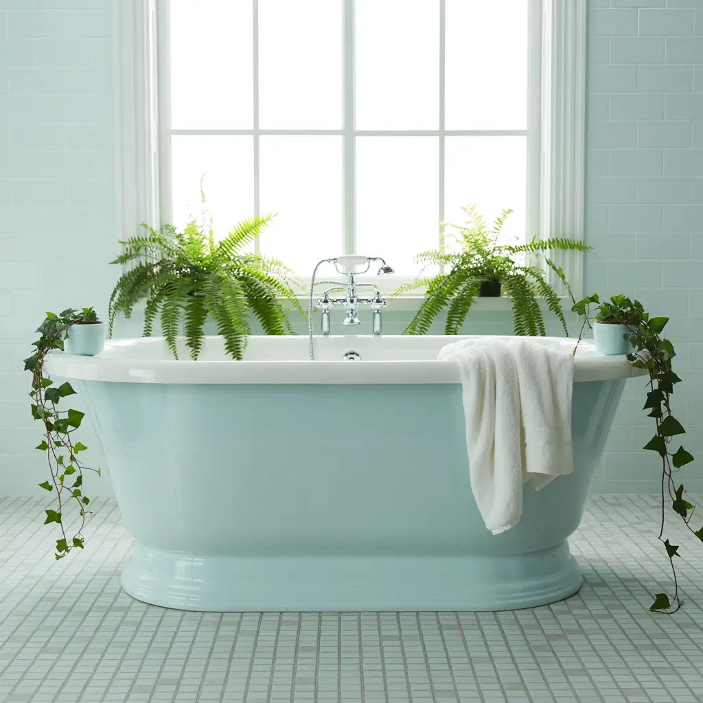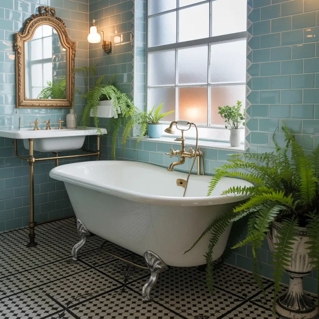 Want to really commit? Add a clawfoot tub if you’ve got the space. Paint the outside baby blue and watch your bathroom transform into something straight out of a vintage magazine. Just remember—this style loves symmetry, so keep things balanced and orderly.