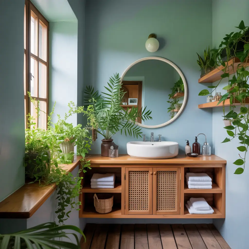 - Light wood vanities or shelving (think birch or pine)