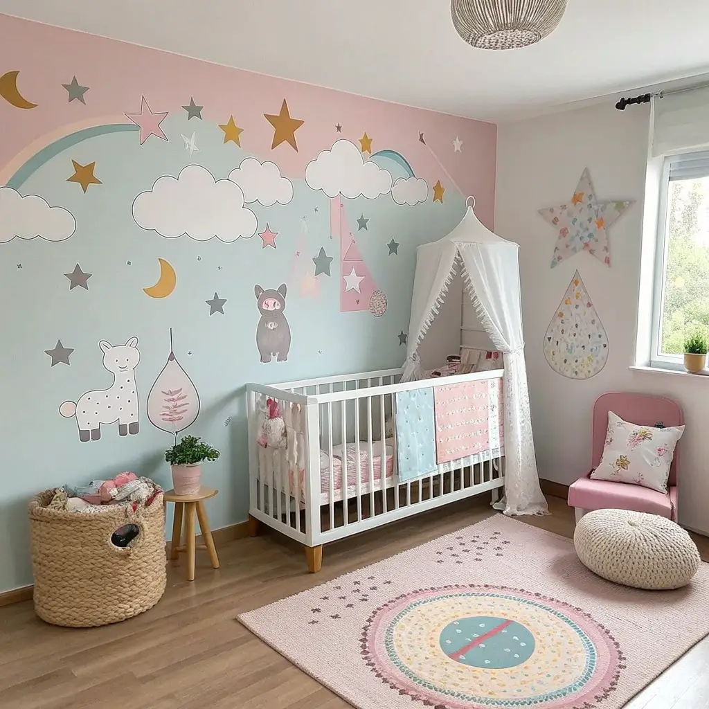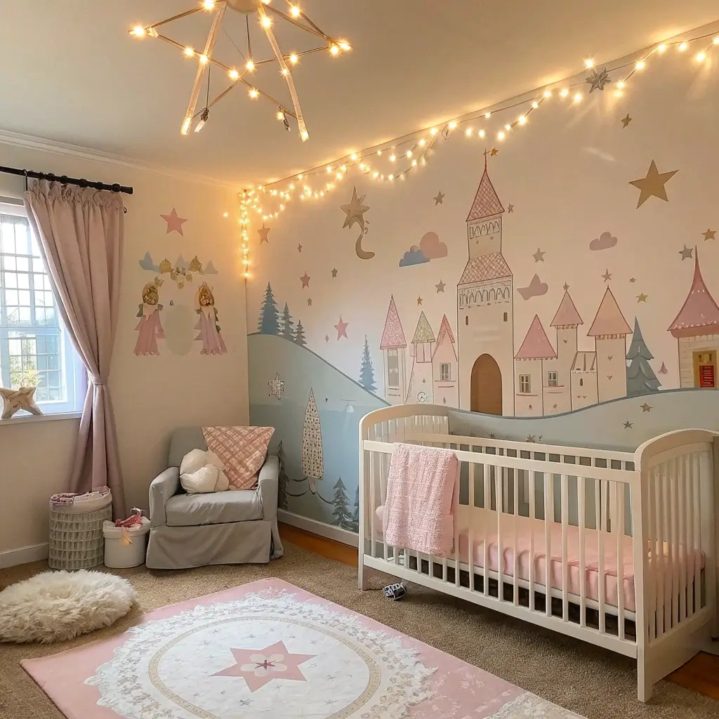 Start with a soft color palette of blush pinks, lavender, and ivory. These colors create that dreamy atmosphere without overwhelming the space. Add a canopy over the crib using sheer fabric – you can find amazing options for under $50 that look like they cost hundreds. Mount it from the ceiling with a simple hook, and boom, instant castle vibes!