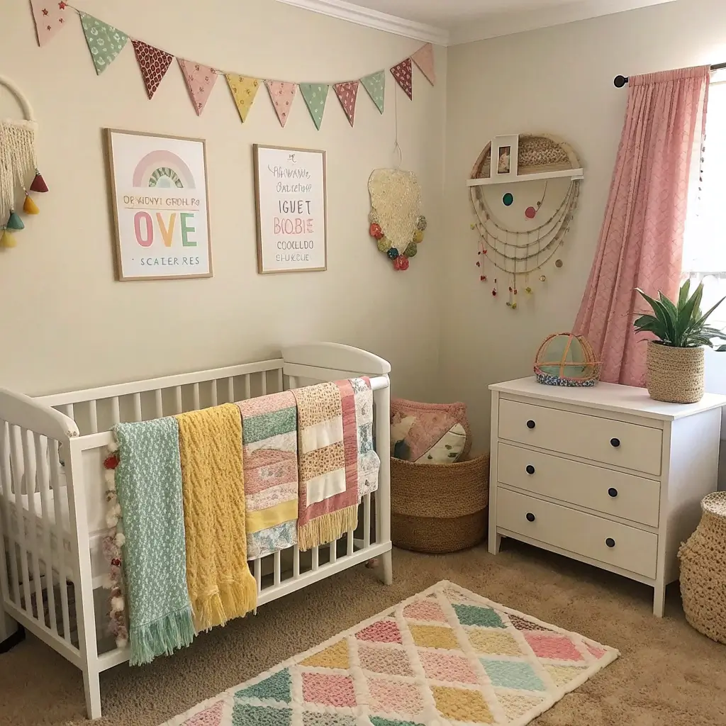 Start with neutral base colors like cream, tan, and terracotta, then layer in pops of dusty rose or burnt orange. Macramé wall hangings are basically required (kidding, but not really), and they’re surprisingly easy to DIY if you’re feeling crafty. I made one during my third trimester while binge-watching Netflix – if I can do it with pregnancy brain, you definitely can!