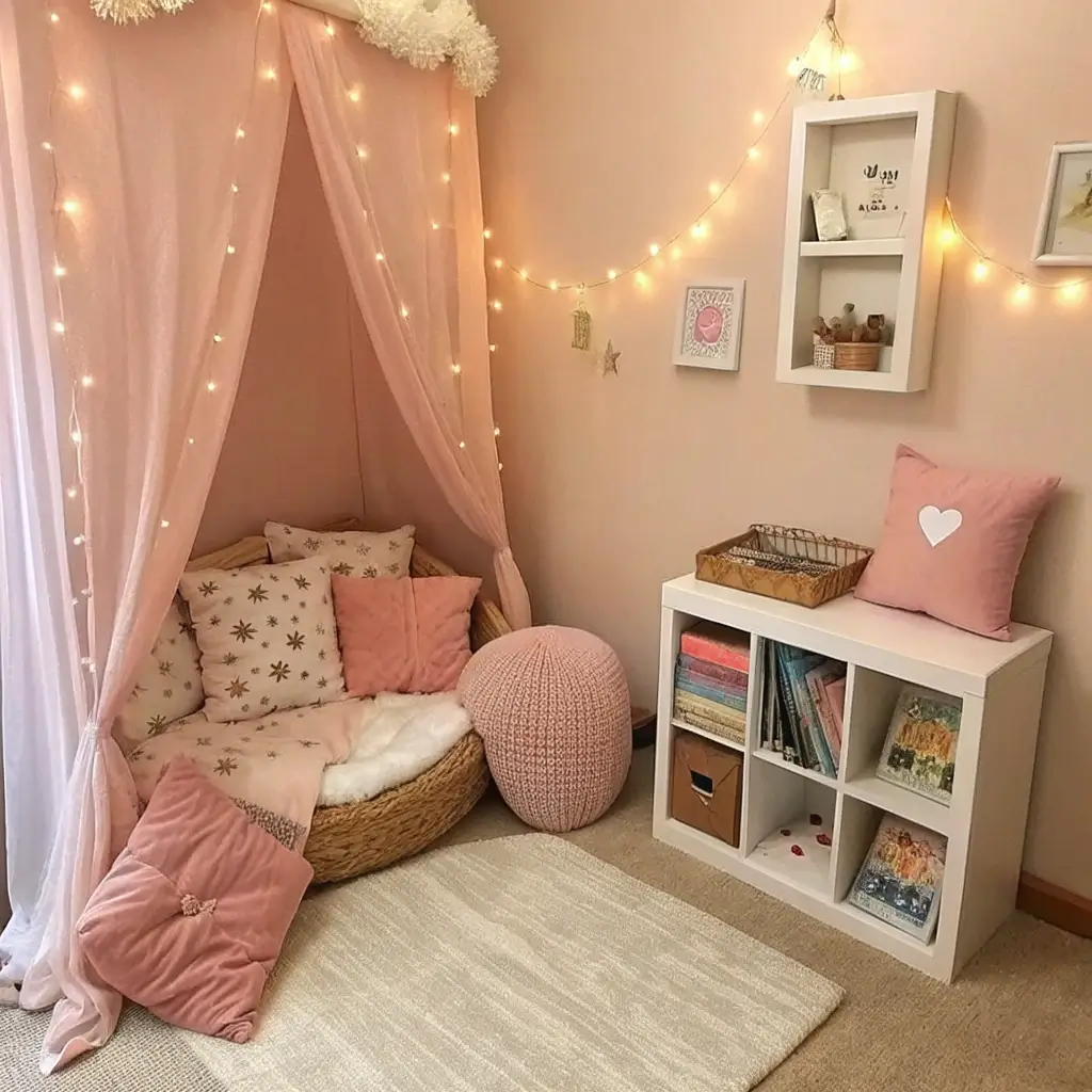 Don’t forget the atmospheric touches. String lights create ambiance, a small rug defines the space, and maybe add a basket for currently reading books. This becomes more than just a reading spot – it’s a bonding space where memories are made.