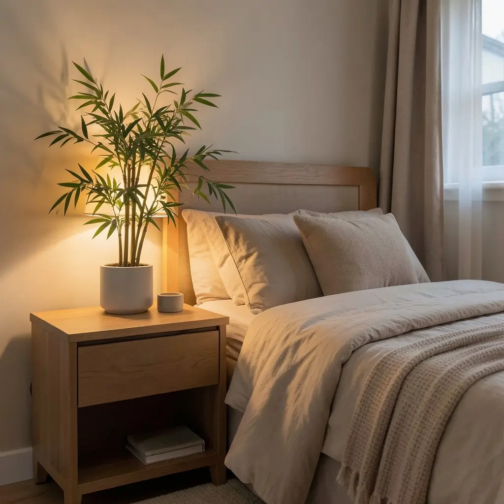 My personal favorite combo: A small lucky bamboo arrangement in a white ceramic pot paired with a warm-toned bedside lamp. The bamboo adds life to the space without being overwhelming, and the simple pot keeps things clean and serene.