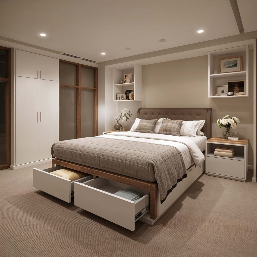 Basement Bedroom with Built-In Storage Solutions