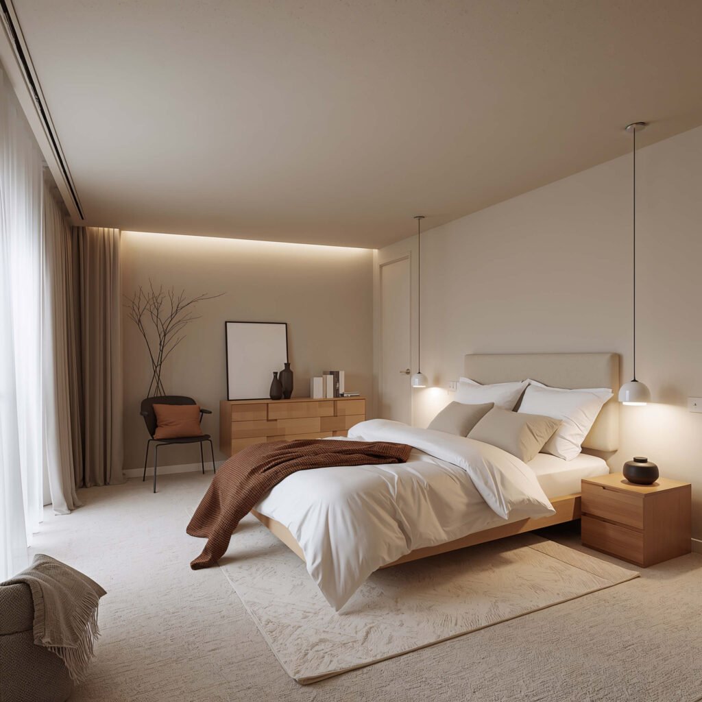 Color palette is everything in minimalist basement bedrooms. Stick to three colors max. I chose white, charcoal gray, and natural wood. That’s it. The consistency creates calm, and calm equals better sleep.
