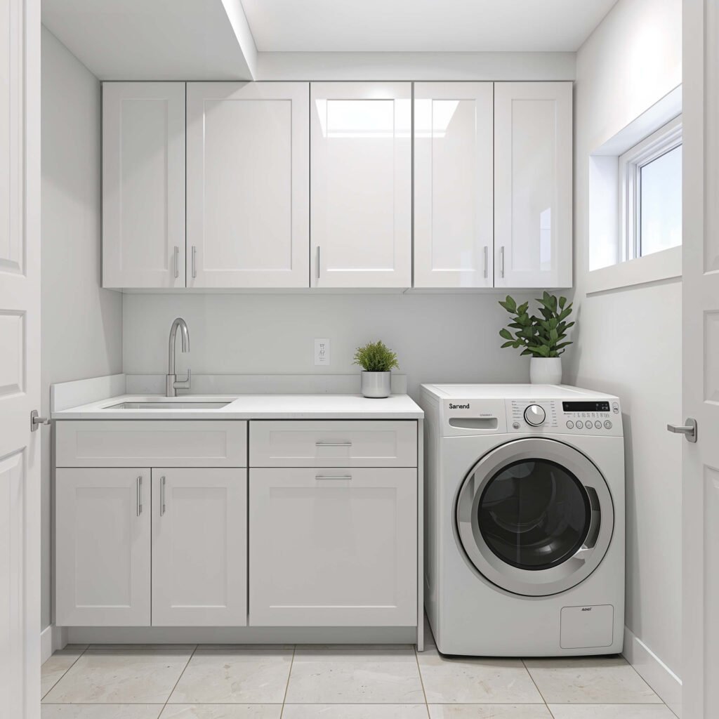 Install floor-to-ceiling cabinets along one wall. The lower cabinets hide cleaning supplies and laundry essentials. Upper cabinets store seasonal items, holiday decorations, or whatever else you’re hoarding. I mean, collecting. 🙂