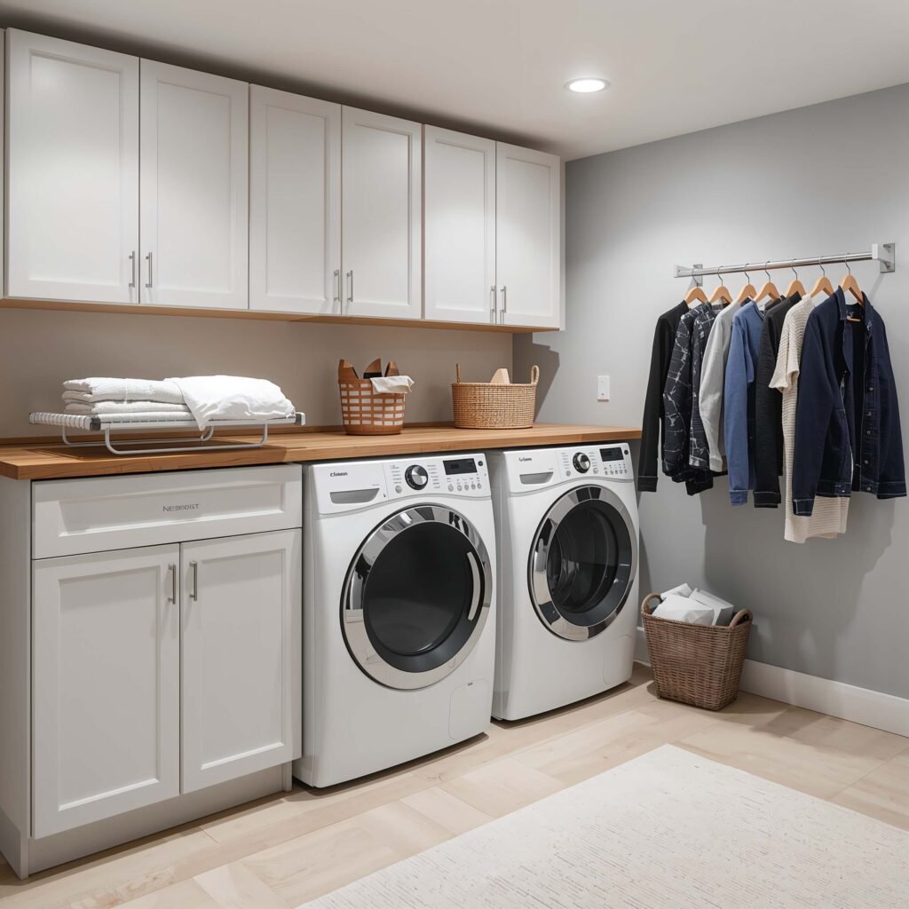 Mount a retractable clothesline or rod above your folding station. Hang clothes straight from the dryer to prevent wrinkles. Add hooks along the wall for items that need air-drying. Pro tip: install the rod high enough that long dresses won’t drag on the counter.
