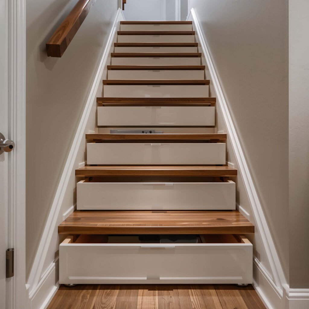 My neighbor installed these and now stores everything from holiday decorations to camping gear under there. The best part? The drawer fronts match their stair risers perfectly, so you’d never know there’s storage hiding there. It’s like having a secret organizational superpower.
