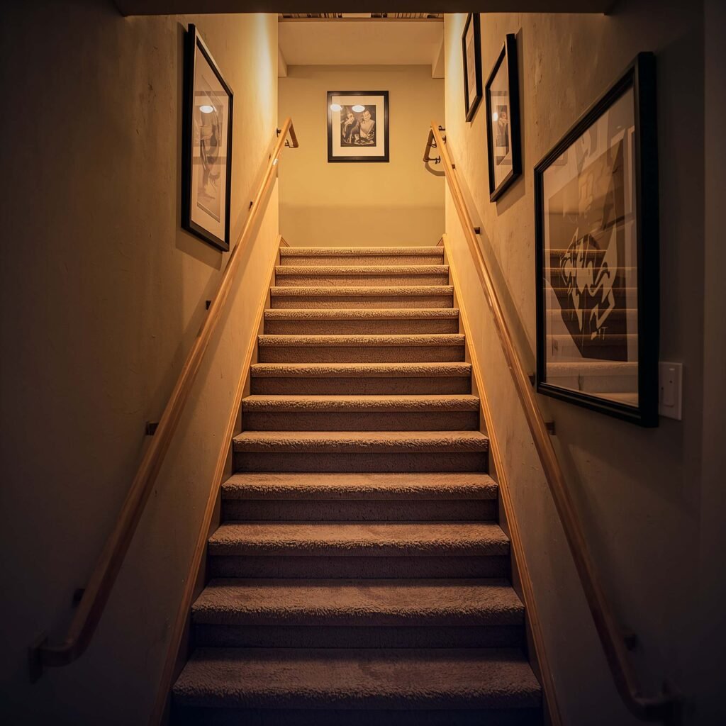 I used to think carpeted basement stairs were outdated, but modern carpet options changed my mind completely. Today’s stair runners come in gorgeous patterns and textures that add both style and safety. Pair this with thoughtfully arranged wall art, and suddenly your stairwell becomes a mini gallery.