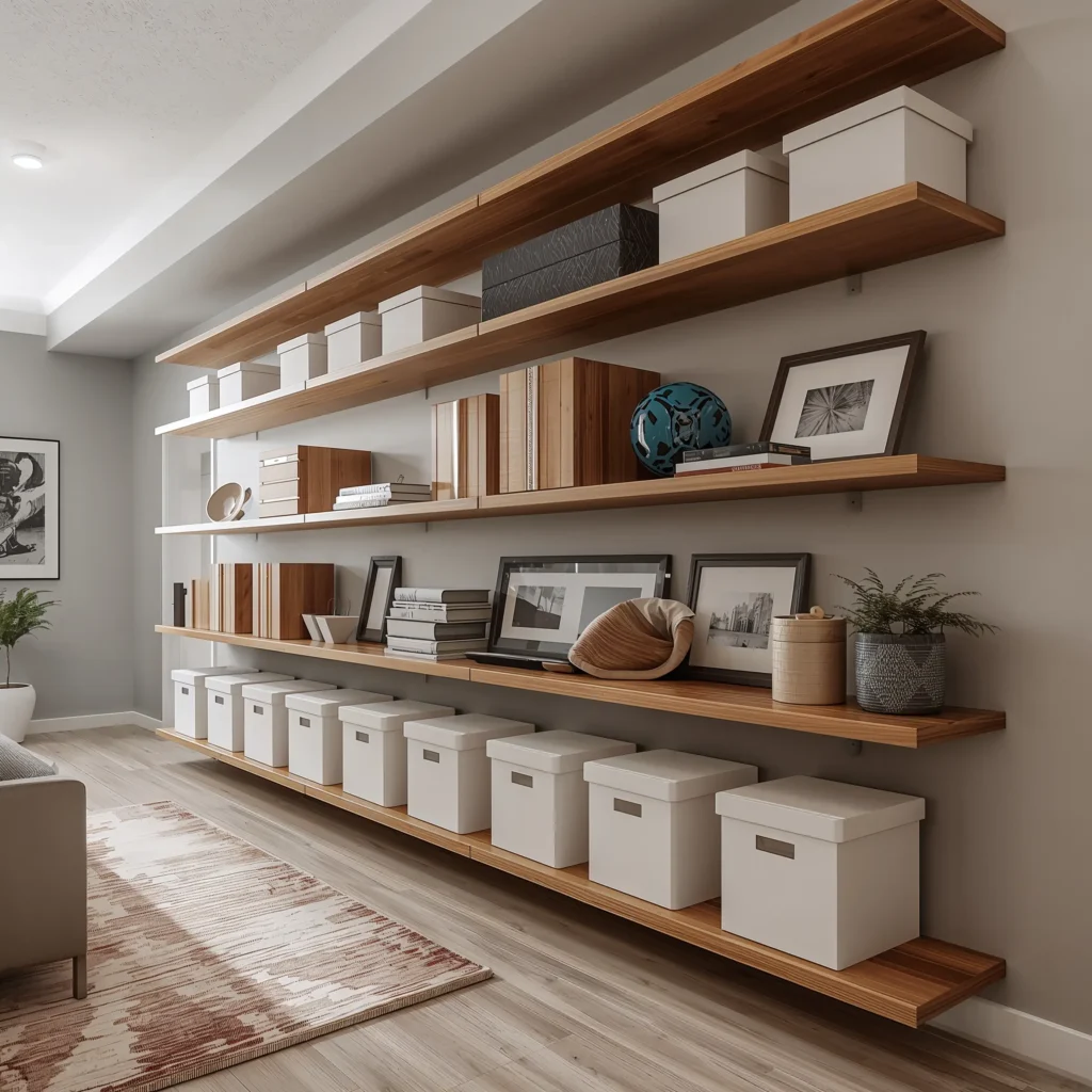 The beauty of floating shelves lies in their simplicity. They don’t eat up floor space, which is crucial when you’re already dealing with limited square footage. Plus, they make everything visible and accessible – no more digging through stacks of boxes to find your holiday lights.