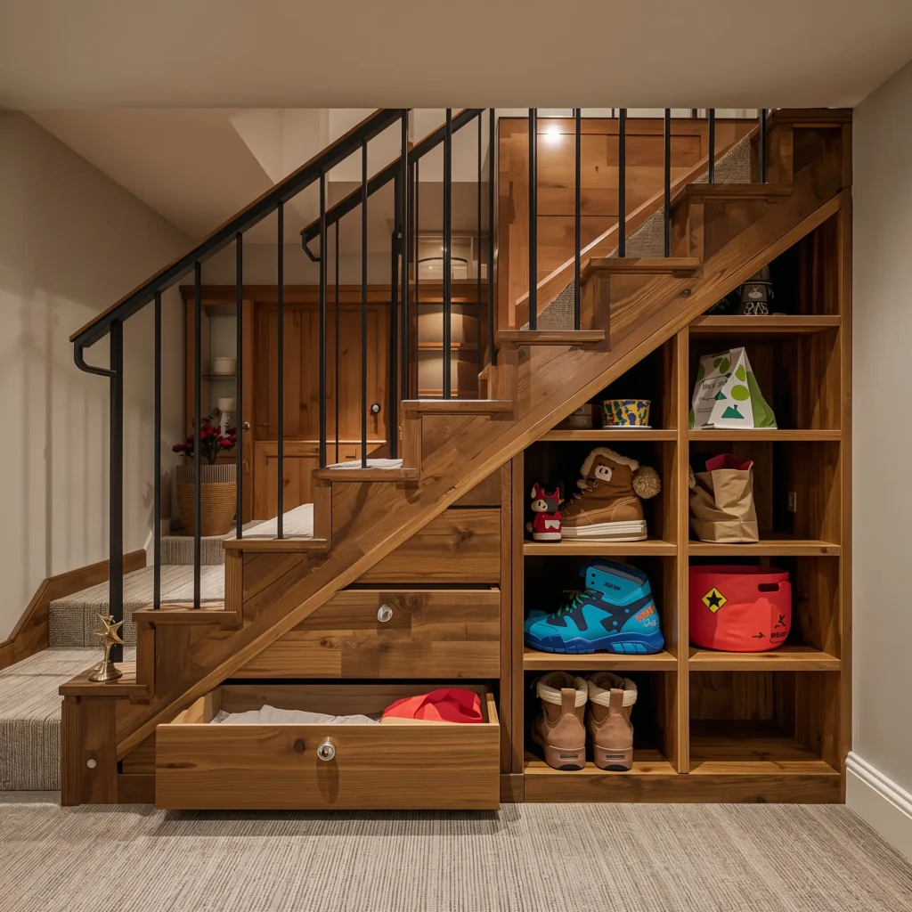 I installed pull-out drawers under my stairs two years ago, and it’s hands-down the best storage decision I’ve made. No more crawling on hands and knees with a flashlight, trying to find the camping gear.