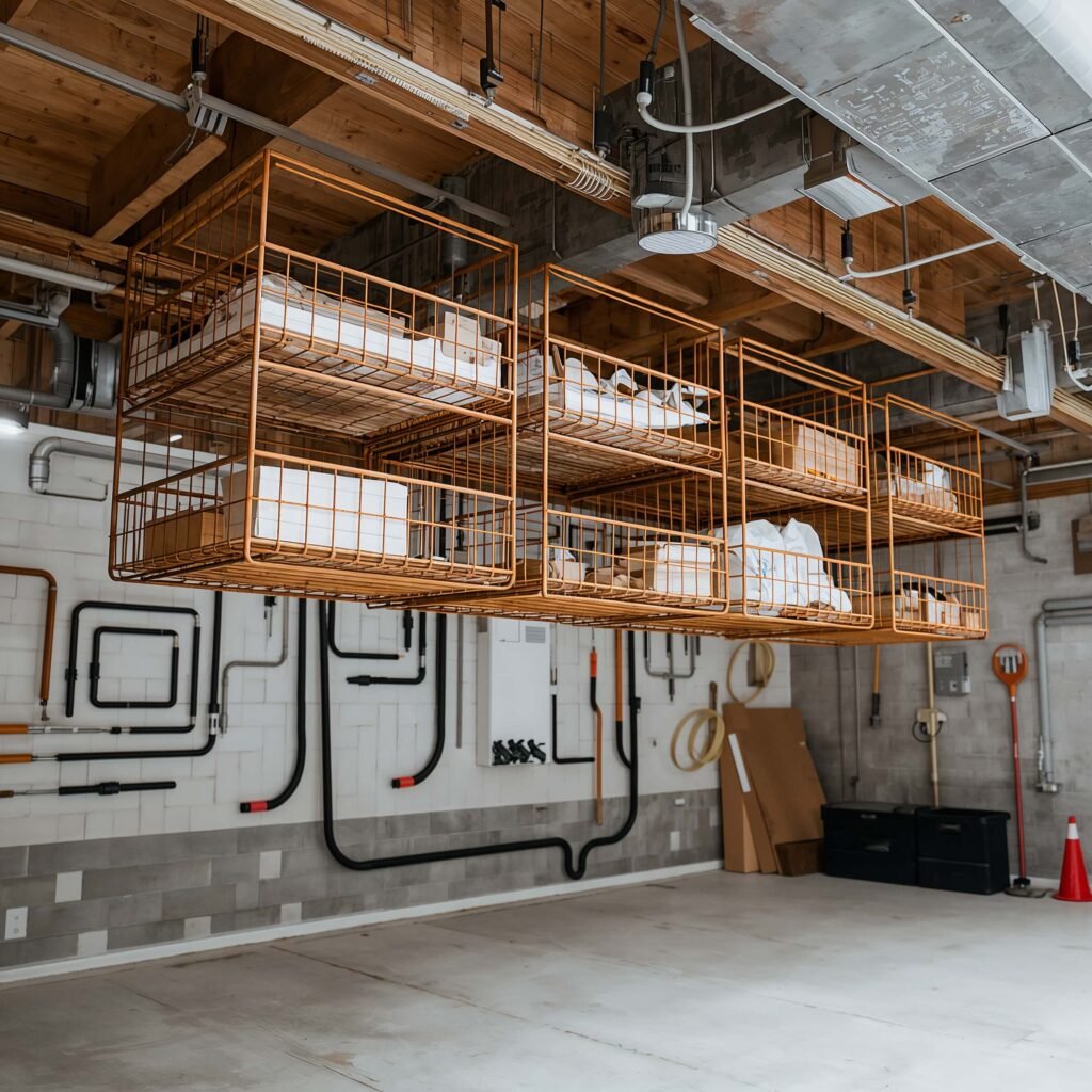 Wire baskets hanging from your basement ceiling joists might seem old school, but they’re having a serious comeback. And for good reason – they use space that literally nothing else can touch.