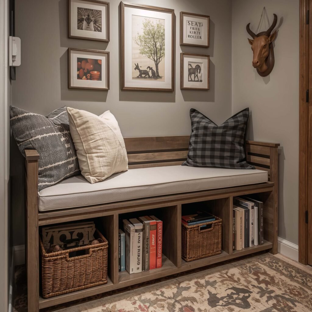 A storage bench in your basement might sound weird, but hear me out. You need somewhere to sit when putting on work boots or sorting through boxes. Why not make that seat pull double duty?
