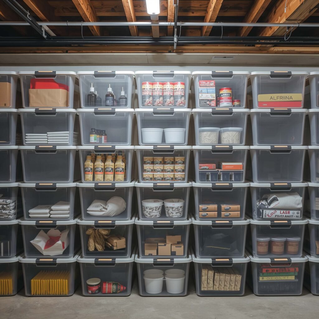 Visibility changes everything. Those opaque bins might look cleaner, but you’ll forget what’s inside within a week. Clear bins eliminate the “mystery box” syndrome that plagues most basements.