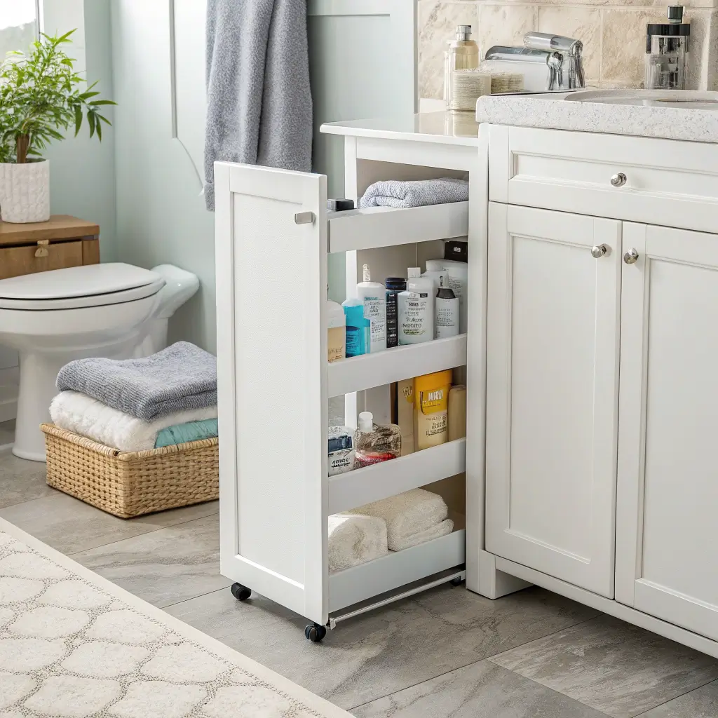 Mine slides perfectly into a 6-inch gap beside my vanity. It holds all my backup toilet paper, extra towels, and those bulk cleaning supplies I couldn’t resist buying. The wheels make it glide out smoothly when I need something, then tuck away invisibly.