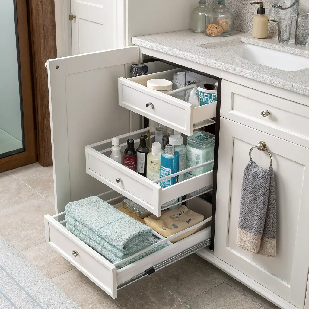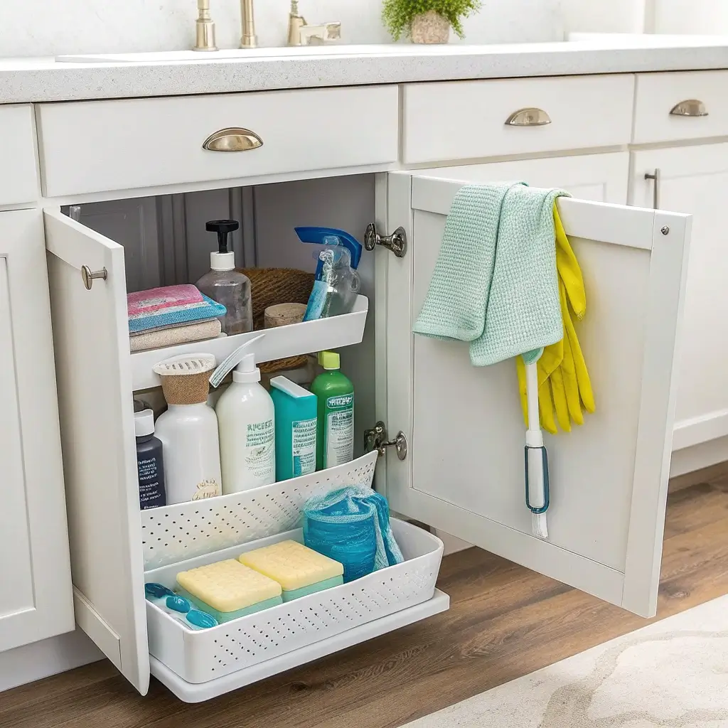 Here’s what makes this solution genius: you install sliding rails that let you pull out entire bins or drawers. No more getting on your hands and knees to reach that one cleaning product hiding in the back corner. Everything glides out smoothly, and you can actually see what you have.