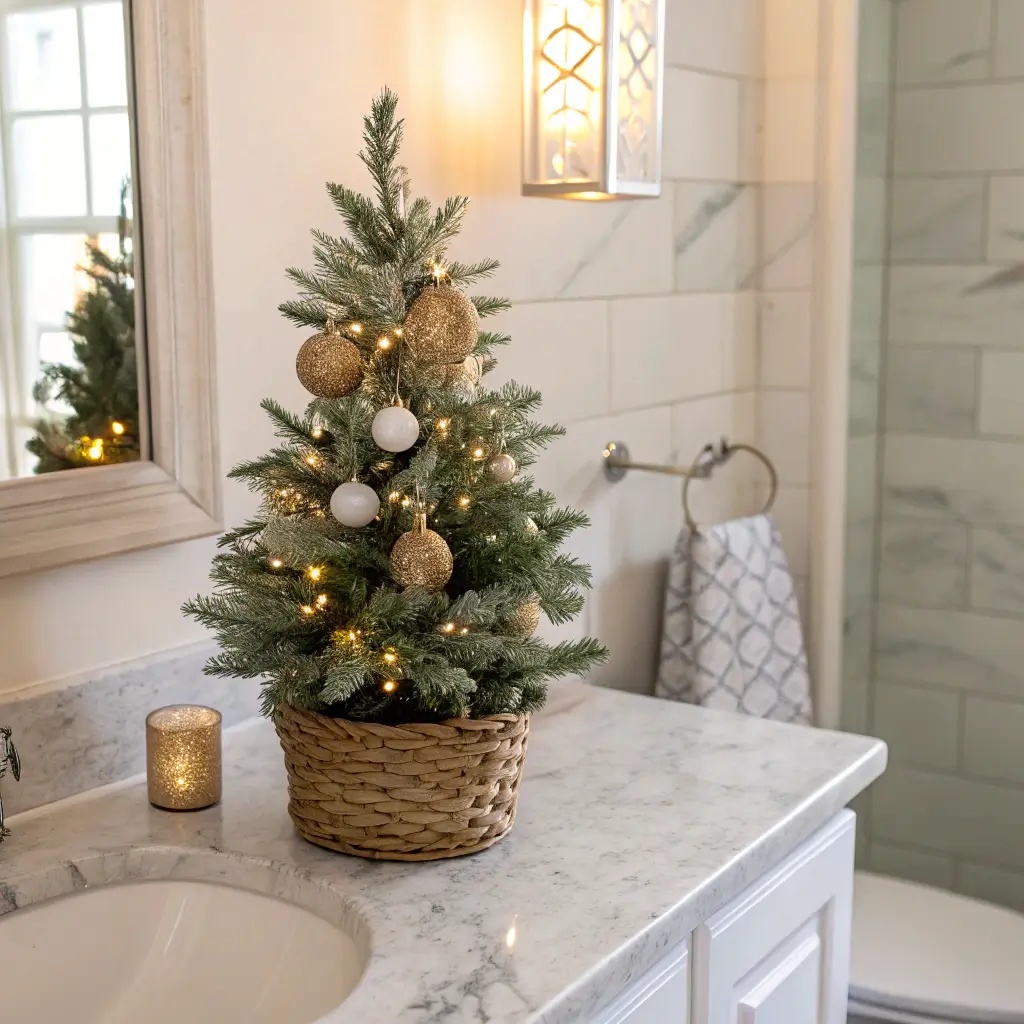Let me tell you about my game-changing discovery last Christmas – mini Christmas trees are bathroom gold! I picked up this adorable 12-inch pre-lit tree from Target for like fifteen bucks, and it completely transformed my vanity area. The best part? You don’t need to worry about watering it or cleaning up pine needles.