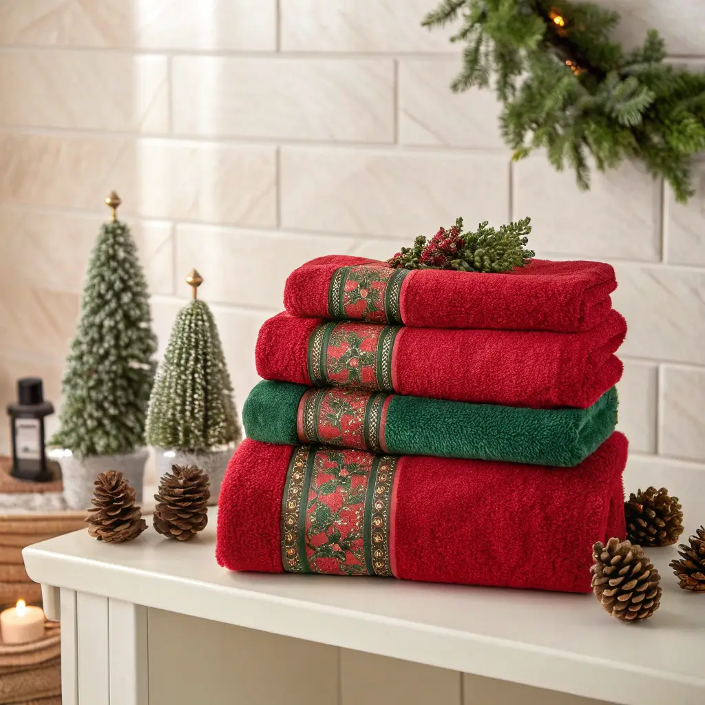 Don’t forget about your regular bath towels! You don’t need to buy entirely new sets – just add festive bath sheets in complementary colors. I stick with solid reds, greens, or crisp whites with metallic trim. They blend seamlessly with your existing towels while adding that holiday touch.
