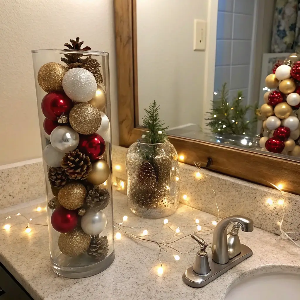 This final touch requires zero effort but delivers maximum impact. Filling clear vases with ornaments instantly adds color and sparkle to any bathroom surface. I keep three different-sized vases ready to go each year.