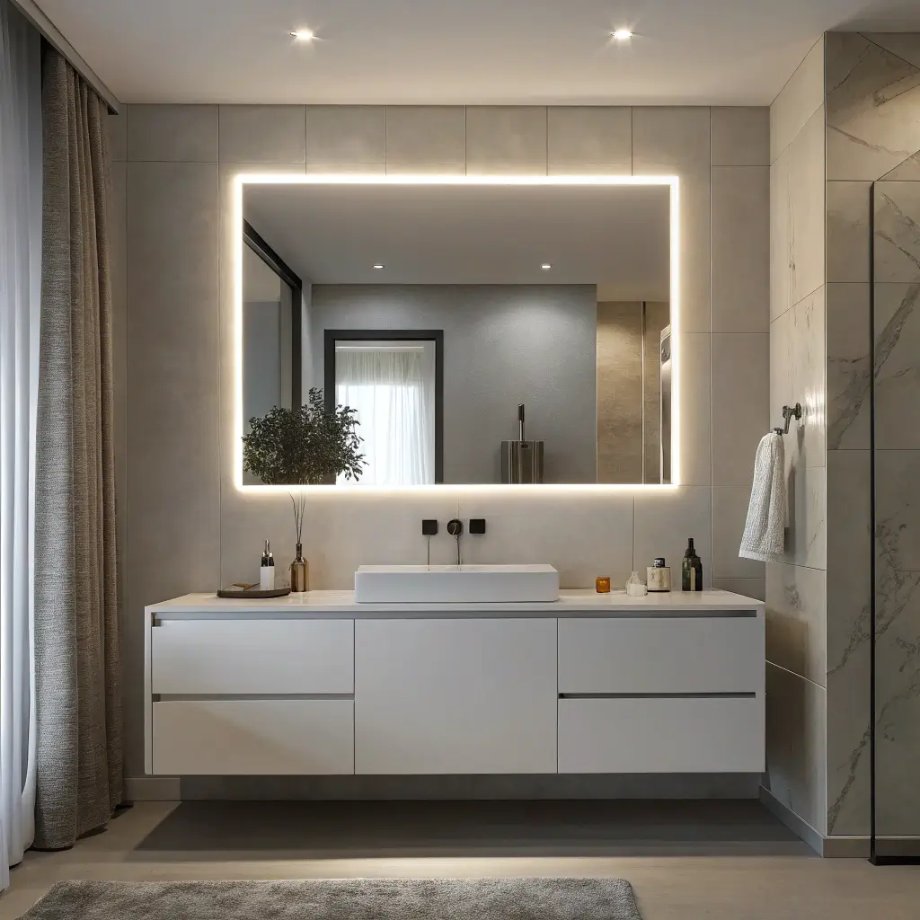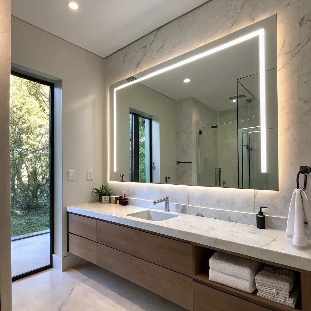 Okay, this one makes me feel like I’m living in the future. Floating backlit fixtures create this amazing halo effect that makes your mirror look like it’s levitating. It’s subtle, sophisticated, and seriously cool.